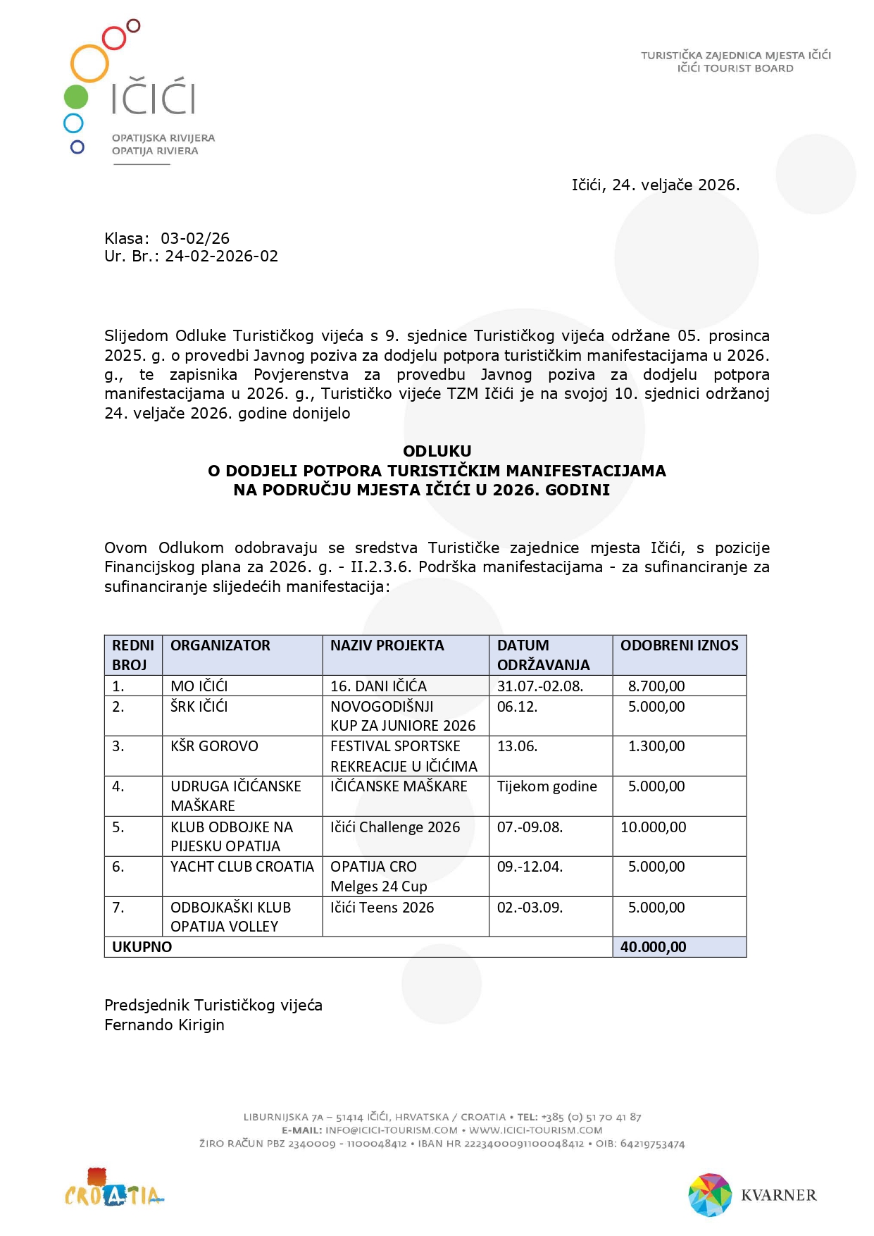 Odluka o dodjeli potpora turističkim manifestacijama na području mjesta Ičići u 2026. godini